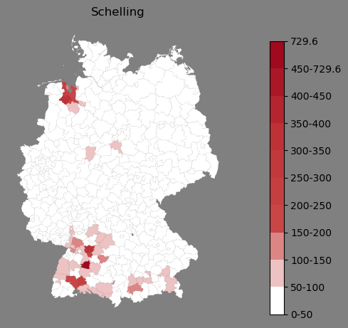 Relative Verteilung des Namens Schelling (1996)Direkt zur Karte Die Farbskala zeigt die Anzahl von "Schelling" bezogen auf je 1 Million Einträge. |