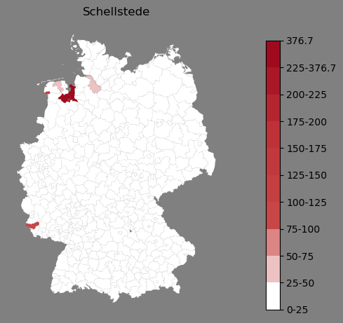 Relative Verteilung des Namens Schellstede (1996)Direkt zur Karte Die Farbskala zeigt die Anzahl von "Schellstede" bezogen auf je 1 Million Einträge. |