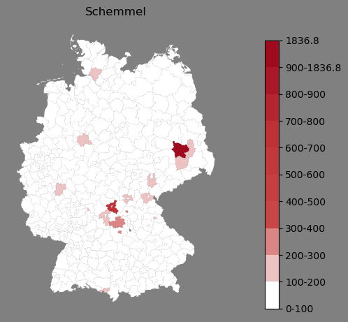 Relative Verteilung des Namens Schemmel (1996)Direkt zur Karte Die Farbskala zeigt die Anzahl von "Schemmel" bezogen auf je 1 Million Einträge. |