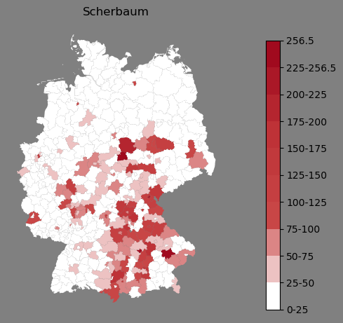 Relative Verteilung des Namens Scherbaum (1996)Direkt zur Karte Die Farbskala zeigt die Anzahl von "Scherbaum" bezogen auf je 1 Million Einträge. |