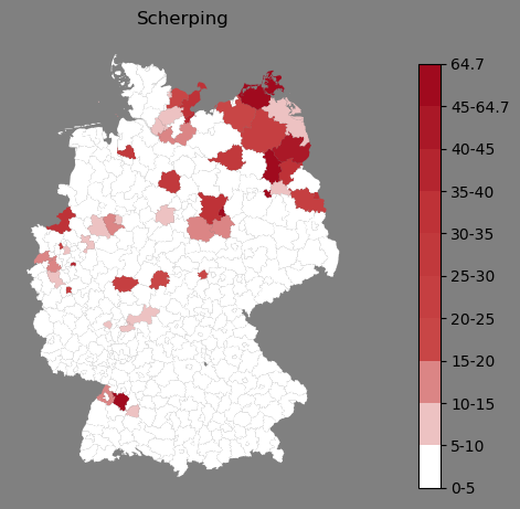 Relative Verteilung des Namens Scherping (1996)Direkt zur Karte Die Farbskala zeigt die Anzahl von "Scherping" bezogen auf je 1 Million Einträge. |