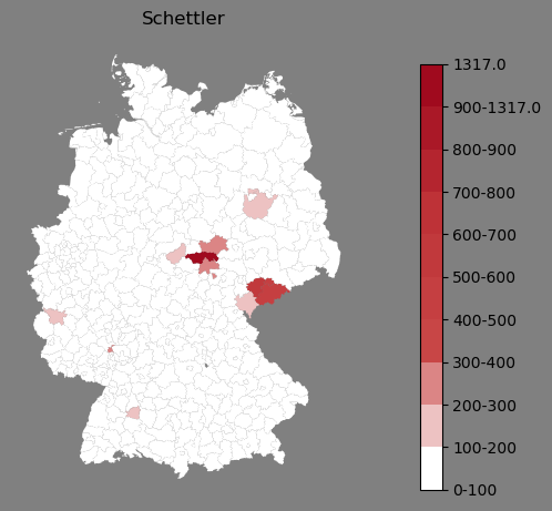 Relative Verteilung des Namens Schettler (1996)Direkt zur Karte Die Farbskala zeigt die Anzahl von "Schettler" bezogen auf je 1 Million Einträge. |