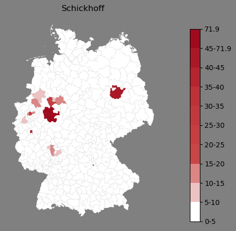 Relative Verteilung des Namens Schickhoff (1996)Direkt zur Karte Die Farbskala zeigt die Anzahl von "Schickhoff" bezogen auf je 1 Million Einträge. |