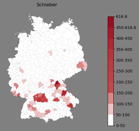 Relative Verteilung des Namens Schieber (1996)Direkt zur Karte Die Farbskala zeigt die Anzahl von "Schieber" bezogen auf je 1 Million Einträge. |