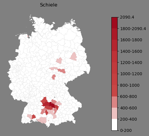 Relative Verteilung des Namens Schiele (1996)Direkt zur Karte Die Farbskala zeigt die Anzahl von "Schiele" bezogen auf je 1 Million Einträge. |