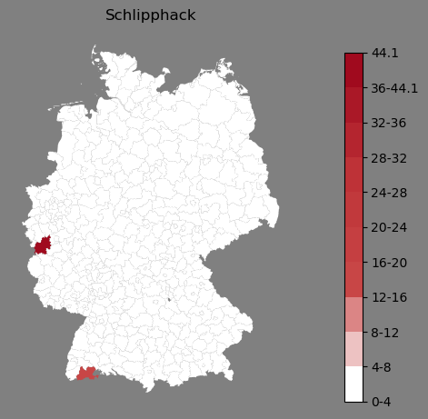 Relative Verteilung des Namens Schlipphack (1996)Direkt zur Karte Die Farbskala zeigt die Anzahl von "Schlipphack" bezogen auf je 1 Million Einträge. |