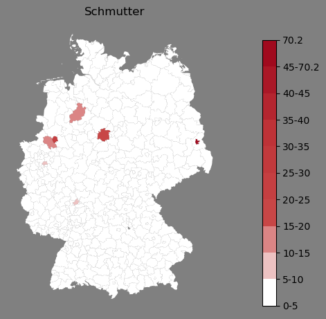 Relative Verteilung des Namens Schmutter (1996)Direkt zur Karte Die Farbskala zeigt die Anzahl von "Schmutter" bezogen auf je 1 Million Einträge. |