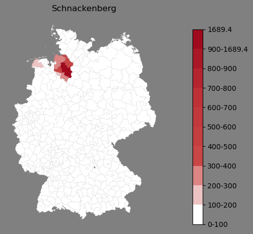 Relative Verteilung des Namens Schnackenberg (1996)Direkt zur Karte Die Farbskala zeigt die Anzahl von "Schnackenberg" bezogen auf je 1 Million Einträge. |