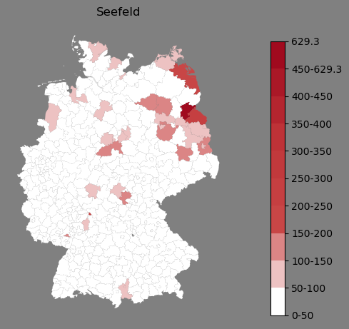 Relative Verteilung des Namens Seefeld (1996)Direkt zur Karte Die Farbskala zeigt die Anzahl von "Seefeld" bezogen auf je 1 Million Einträge. |