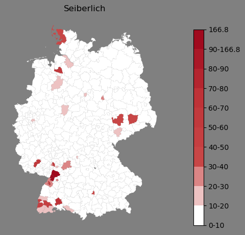 Relative Verteilung des Namens Seiberlich (1996)Direkt zur Karte Die Farbskala zeigt die Anzahl von "Seiberlich" bezogen auf je 1 Million Einträge. |