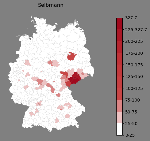 Relative Verteilung des Namens Selbmann (1996)Direkt zur Karte Die Farbskala zeigt die Anzahl von "Selbmann" bezogen auf je 1 Million Einträge. |