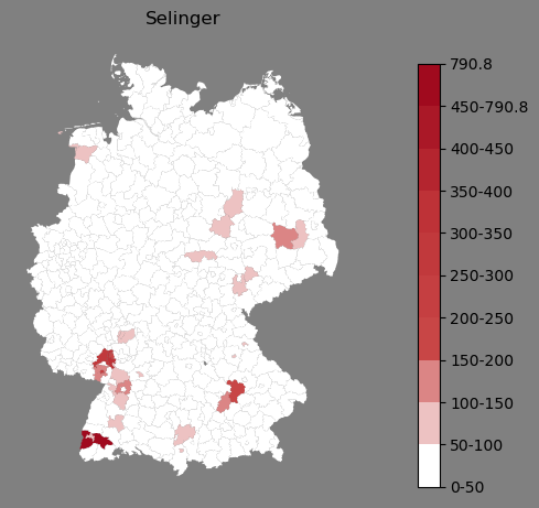 Relative Verteilung des Namens Selinger (1996)Direkt zur Karte Die Farbskala zeigt die Anzahl von "Selinger" bezogen auf je 1 Million Einträge. |