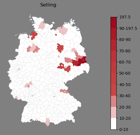 Relative Verteilung des Namens Selling (1996)Direkt zur Karte Die Farbskala zeigt die Anzahl von "Selling" bezogen auf je 1 Million Einträge. |