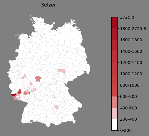 Relative Verteilung des Namens Selzer (1996)Direkt zur Karte Die Farbskala zeigt die Anzahl von "Selzer" bezogen auf je 1 Million Einträge. |