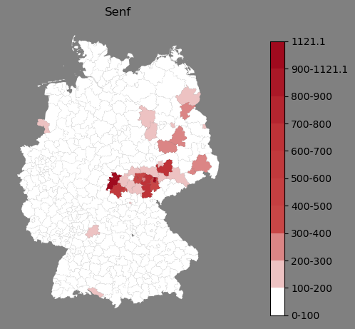 Relative Verteilung des Namens Senf (1996)Direkt zur Karte Die Farbskala zeigt die Anzahl von "Senf" bezogen auf je 1 Million Einträge. |