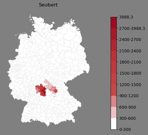 Relative Verteilung des Namens Seubert (1996)Direkt zur Karte Die Farbskala zeigt die Anzahl von "Seubert" bezogen auf je 1 Million Einträge. |
