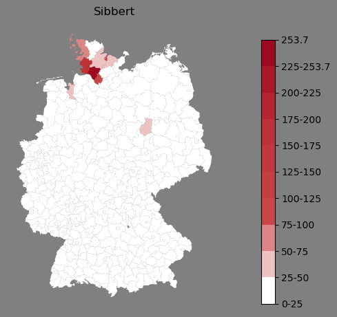 Relative Verteilung des Namens Sibbert (1996)Direkt zur Karte Die Farbskala zeigt die Anzahl von "Sibbert" bezogen auf je 1 Million Einträge. |
