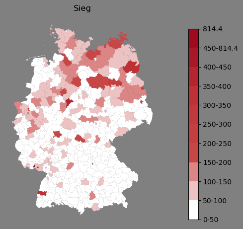 Relative Verteilung des Namens Sieg (1996)Direkt zur Karte Die Farbskala zeigt die Anzahl von "Sieg" bezogen auf je 1 Million Einträge. |
