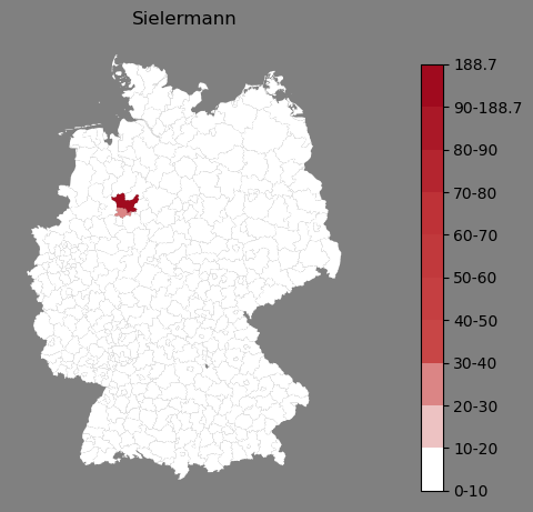 Relative Verteilung des Namens Sielermann (1996)Direkt zur Karte Die Farbskala zeigt die Anzahl von "Sielermann" bezogen auf je 1 Million Einträge. |