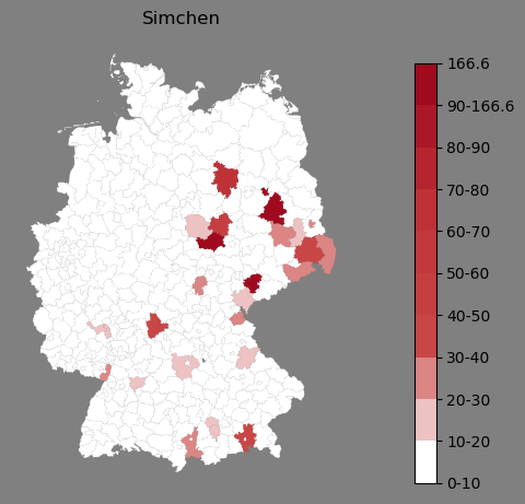 Relative Verteilung des Namens Simchen (1996)Direkt zur Karte Die Farbskala zeigt die Anzahl von "Simchen" bezogen auf je 1 Million Einträge. |