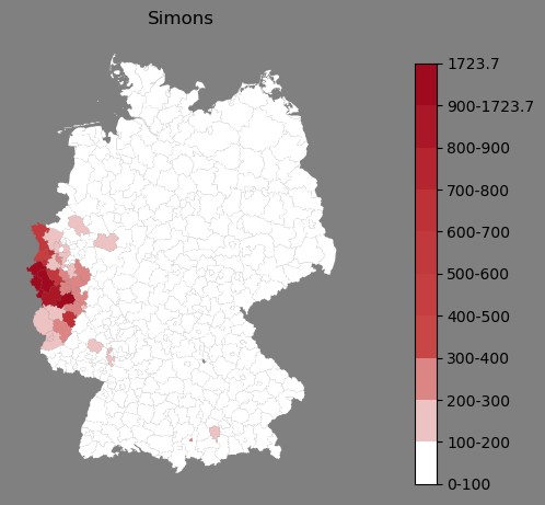 Absolute Verteilung des Namens Simons (1890)Direkt zur Karte Absolute Verteilung des Namens "Simons" um 1890 im damaligen Deutschen Reich Sie können die Karte innerhalb des Fensters zoomen und verschieben. |