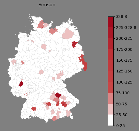 Relative Verteilung des Namens Simson (1996)Direkt zur Karte Die Farbskala zeigt die Anzahl von "Simson" bezogen auf je 1 Million Einträge. |