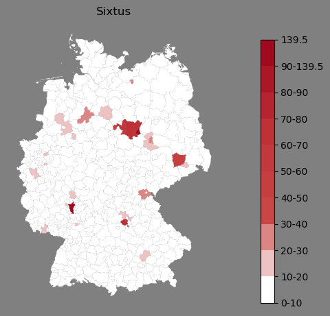 Relative Verteilung des Namens Sixtus (1996)Direkt zur Karte Die Farbskala zeigt die Anzahl von "Sixtus" bezogen auf je 1 Million Einträge. |