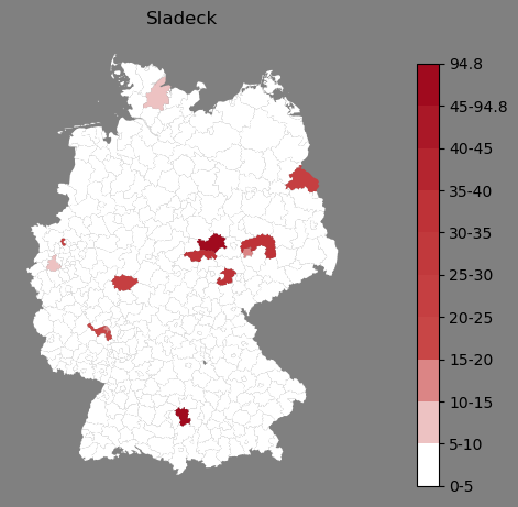 Relative Verteilung des Namens Sladeck (1996)Direkt zur Karte Die Farbskala zeigt die Anzahl von "Sladeck" bezogen auf je 1 Million Einträge. |