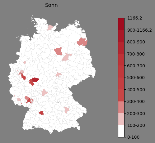 Relative Verteilung des Namens Sohn (1996)Direkt zur Karte Die Farbskala zeigt die Anzahl von "Sohn" bezogen auf je 1 Million Einträge. |
