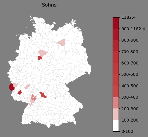 Absolute Verteilung des Namens Sohns (1890)Direkt zur Karte Absolute Verteilung des Namens "Sohns" um 1890 im damaligen Deutschen Reich Sie können die Karte innerhalb des Fensters zoomen und verschieben. |
