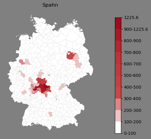 Relative Verteilung des Namens Spahn (1996)Direkt zur Karte Die Farbskala zeigt die Anzahl von "Spahn" bezogen auf je 1 Million Einträge. |