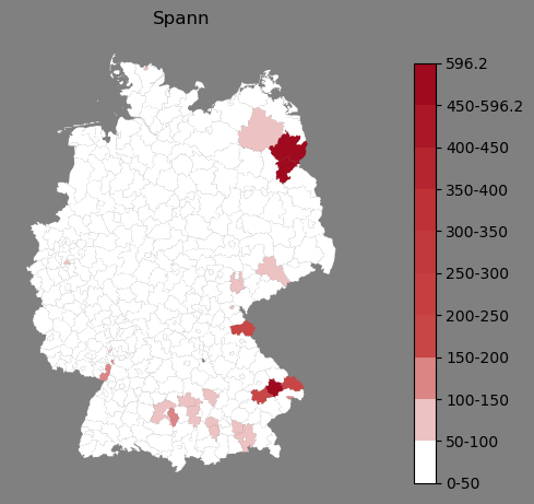Relative Verteilung des Namens Spann (1996)Direkt zur Karte Die Farbskala zeigt die Anzahl von "Spann" bezogen auf je 1 Million Einträge. |