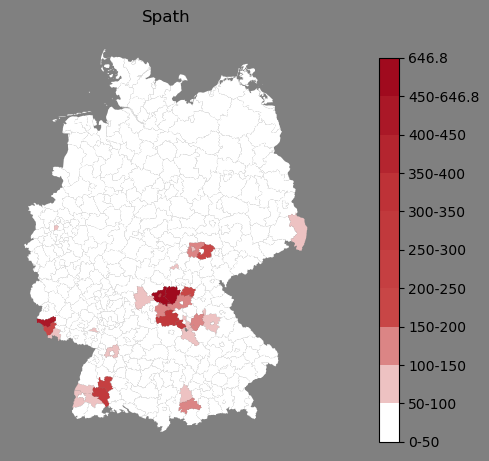 Relative Verteilung des Namens Spath (1996)Direkt zur Karte Die Farbskala zeigt die Anzahl von "Spath" bezogen auf je 1 Million Einträge. |