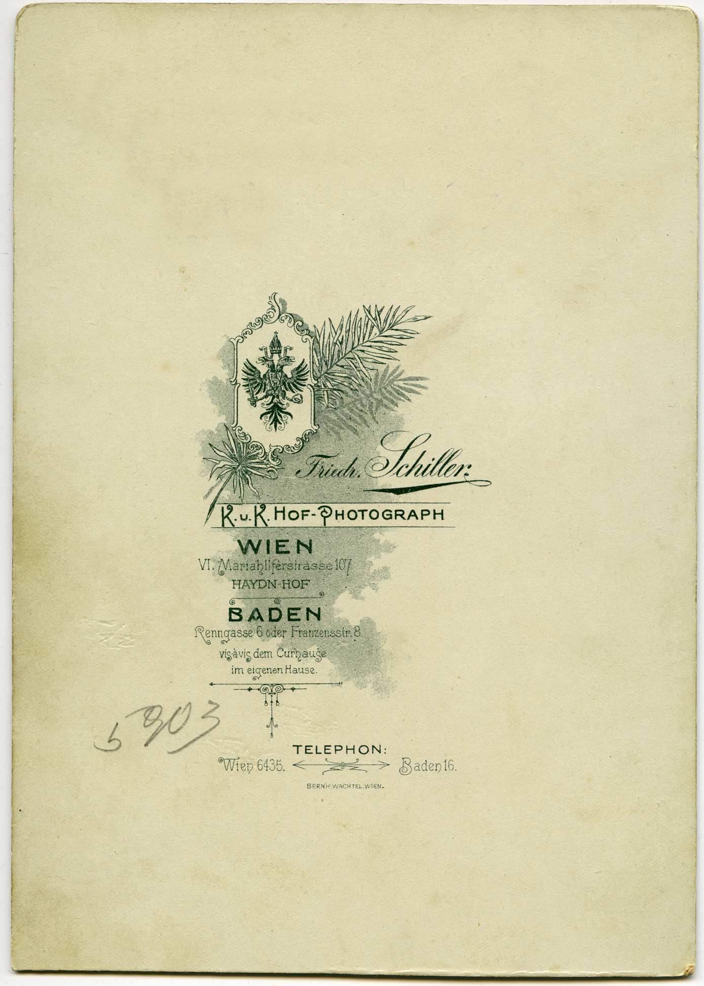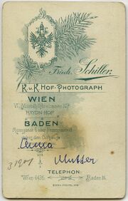 | 12:00, 15. Mai 2015 | Schiller002.png (Datei) | 4,36 MB | {{Infobox Fotostudio |**** Angaben zum Atelier **** | Name des Ateliers = Friedr. Schiller k.u.k. Hof-Photograph | Vorname Inhaber/Eigentümer = Friedrich | Familienname Inhaber = Schiller | Ort | 1 | |