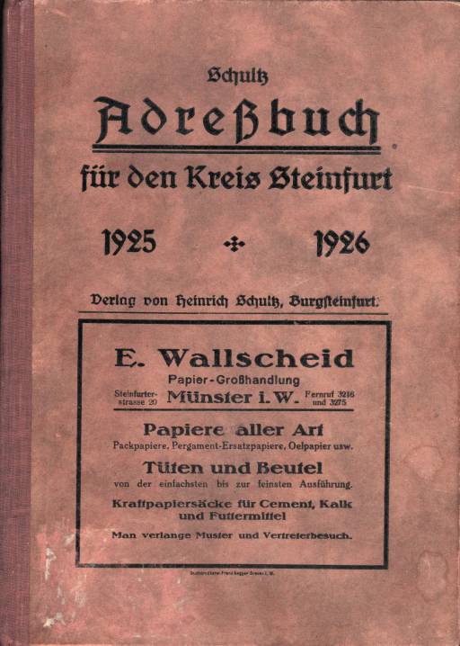 | 16:08, 9. Apr. 2006 | Steinfurt2.jpg (Datei) | 55 KB | * Rückseite Adreßbuch des Kreises Steinfurt 1925/1926 * Scan vom 09.04.2006 / Michael Klävers * Lizenz: GNU FDL | 1 | |