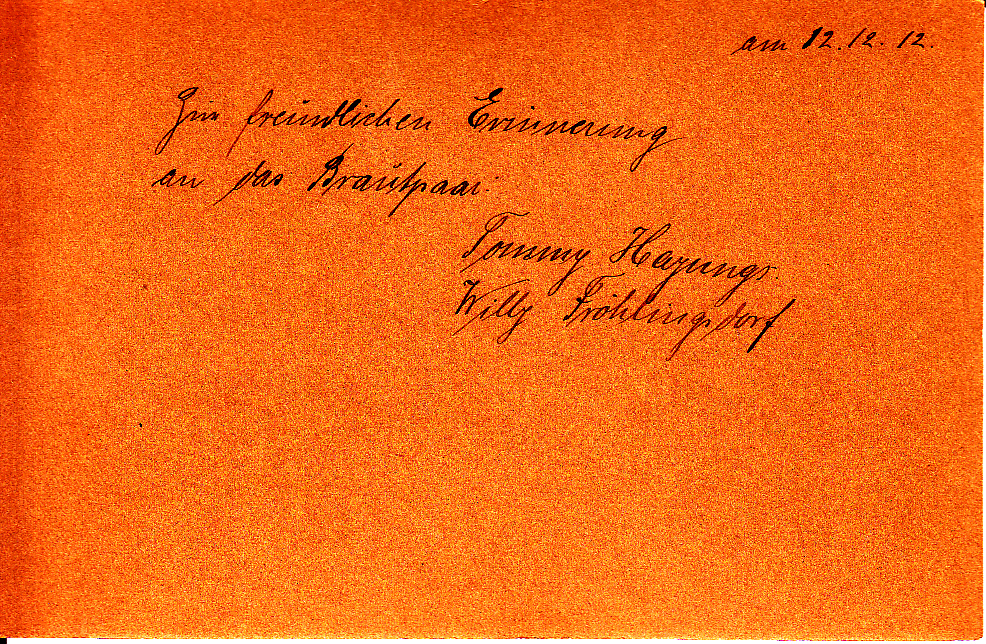 20:38, 27. Dez. 2018 Meents hinten.jpg (Datei) 1,04 MB {{Information |Beschreibung = Brautpaar Tommy Hajungs und Willy Fröhlingsdorf |Quelle = eigenes Foto |Urheber = [[User:Kho|Holger (Osterbuhr){{Copyright GenWiki |Datum = erstellt am 27.12.2018 |Scans = |Genehmigung = {{Copyright GenWiki|Kho}} |Andere_Ve 1
