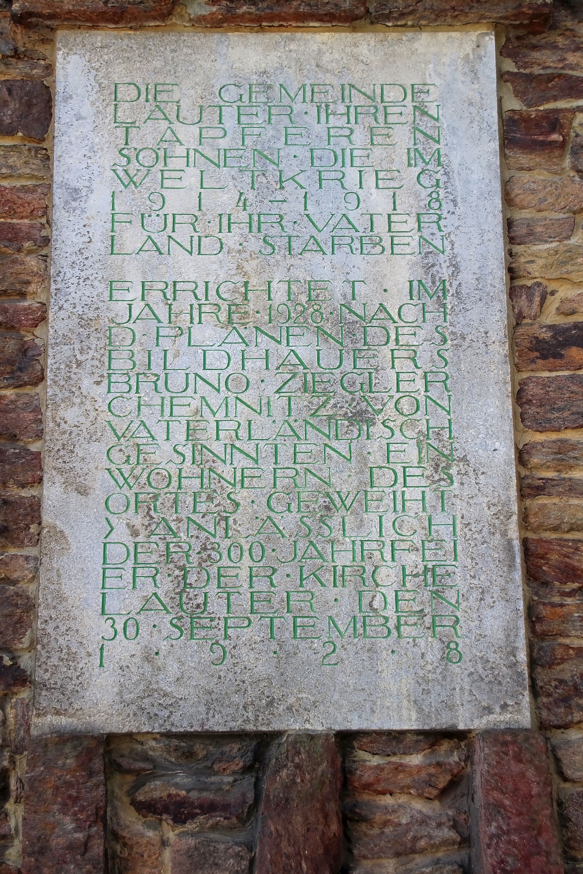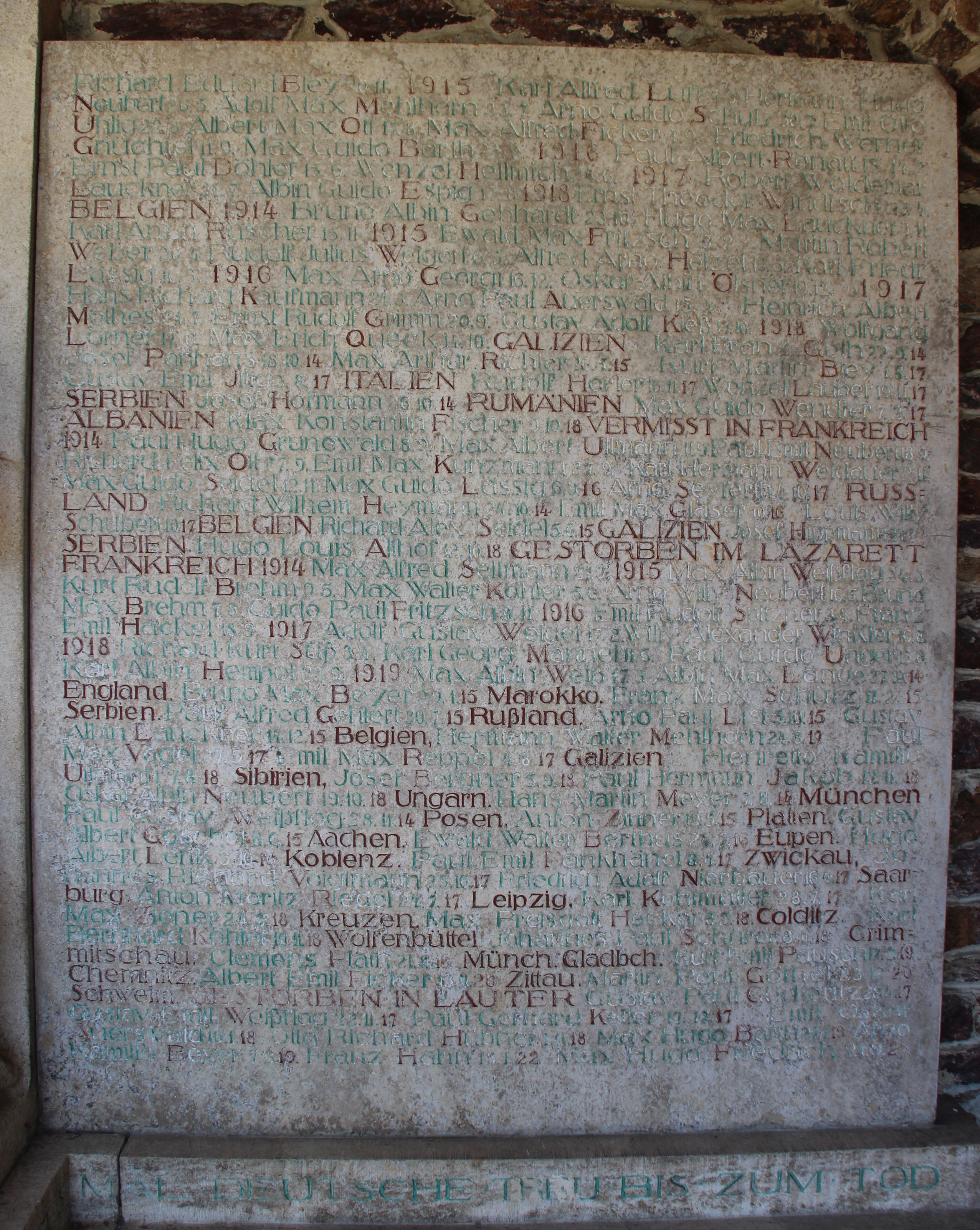 | 18:35, 29. Mär. 2021 | Lauter Ehrenmal 08.JPG (Datei) | 1,71 MB | {{Information |Beschreibung = Glockenehrenmal in Lauter/Sa., Tafel an der Rückseite Kategorie:Lauter (Sachsen |Quelle = eigenes Foto |Urheber = Volker Zimmer |Datum = 07.04.2018 |Scans = |Genehmigung = |Andere_Versionen = |Anmerkungen = }} [[C | 1 | |