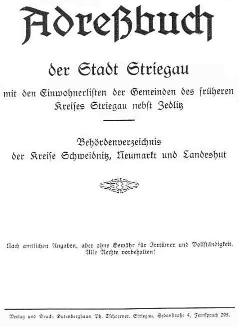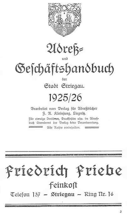 | 11:24, 10. Mai 2007 | Striegau Adressbuch 1905-06.jpg (Datei) | 14 KB | *Beschreibung: Titel Adressbuch Striegau *Quelle: scan *Fotograf oder Zeichner: *Andere Version: - *Lizenzstatus: PD | 1 | |