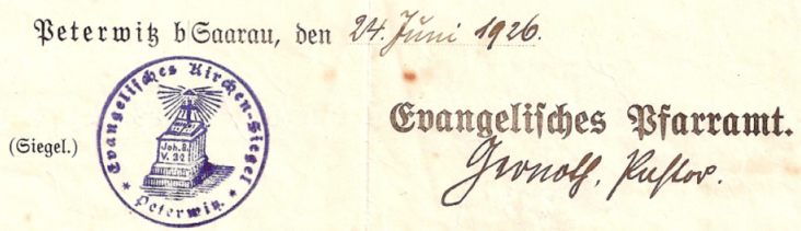 | 09:32, 28. Mär. 2007 | Peterwitz krs schweidnitz taufschein 1926.jpg (Datei) | 27 KB | *Beschreibung: Peterwitz Krs. Schweidnitz - Kirchensiegel ev. Kirche *Quelle: scan *Fotograf oder Zeichner: VZimmer *Andere Version: - *Lizenzstatus: PD {{PD-User|VZimmer}} | 1 | |