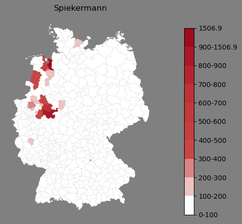 Absolute Verteilung des Namens Spiekermann (1890)Direkt zur Karte Absolute Verteilung des Namens "Spiekermann" um 1890 im damaligen Deutschen Reich Sie können die Karte innerhalb des Fensters zoomen und verschieben. |