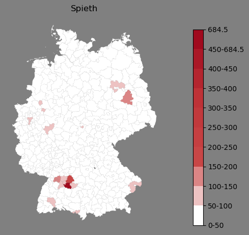 Relative Verteilung des Namens Spieth (1996)Direkt zur Karte Die Farbskala zeigt die Anzahl von "Spieth" bezogen auf je 1 Million Einträge. |