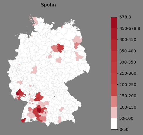 Relative Verteilung des Namens Spohn (1996)Direkt zur Karte Die Farbskala zeigt die Anzahl von "Spohn" bezogen auf je 1 Million Einträge. |