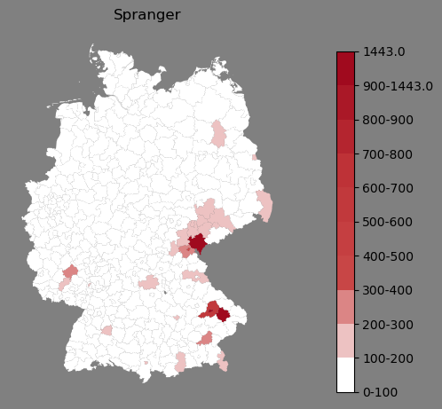 Relative Verteilung des Namens Spranger (1996)Direkt zur Karte Die Farbskala zeigt die Anzahl von "Spranger" bezogen auf je 1 Million Einträge. |