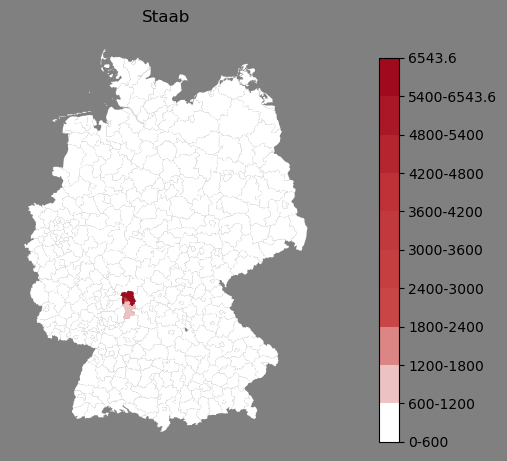 Relative Verteilung des Namens Staab (1996)Direkt zur Karte Die Farbskala zeigt die Anzahl von "Staab" bezogen auf je 1 Million Einträge. |