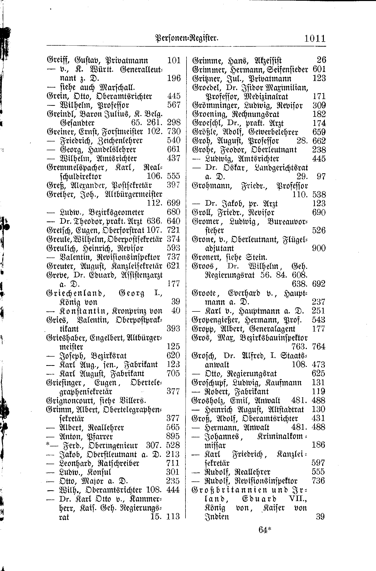 | -- v., K. Württ. Generaleutnant z. D. | 196 | Grimmer, Hermann, Seifensieder | 601 |