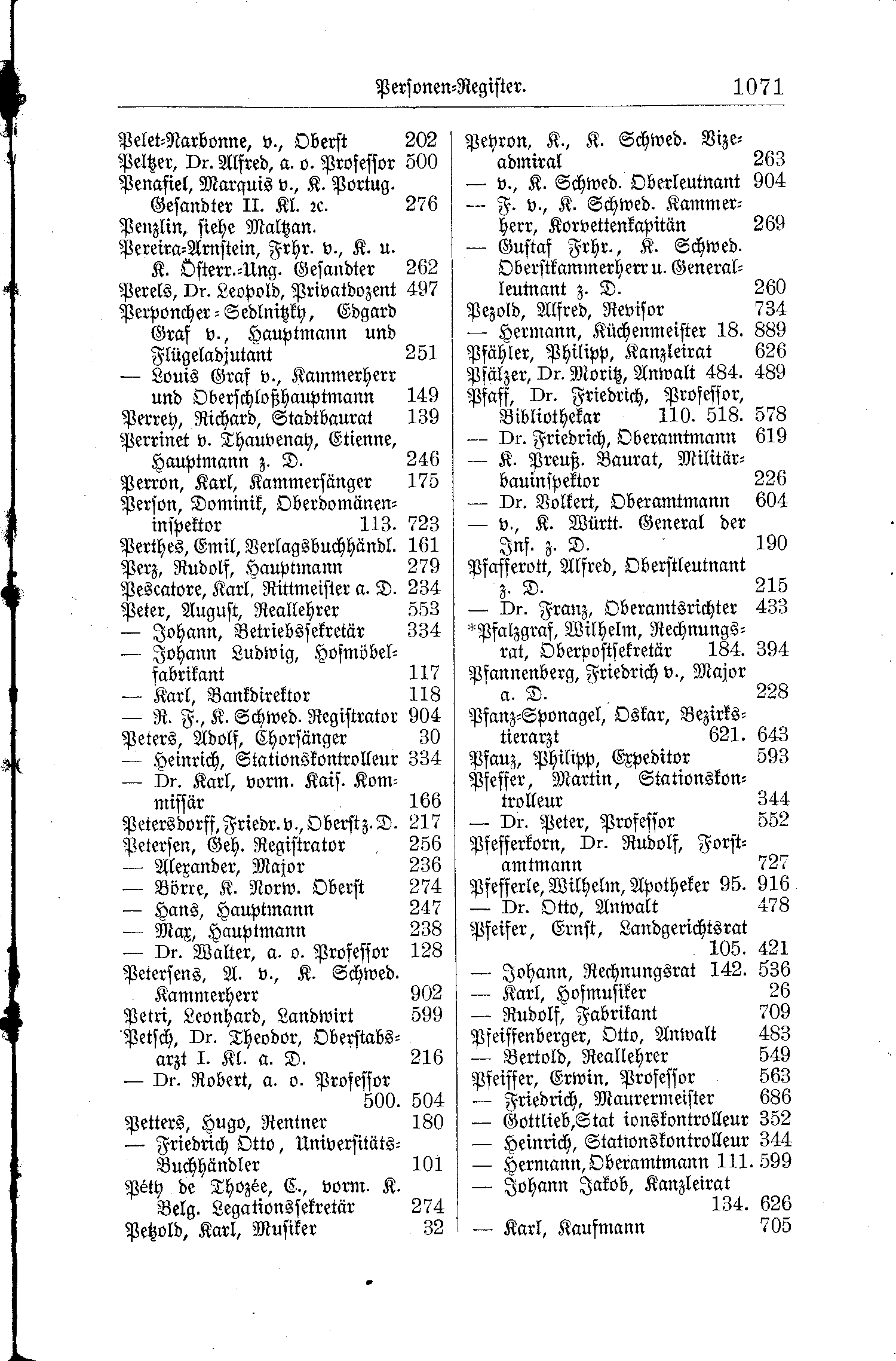 Petersens, A. v., K. Schwed. Kammerherr 902 Pfeiffer, Erwin, Professor 563