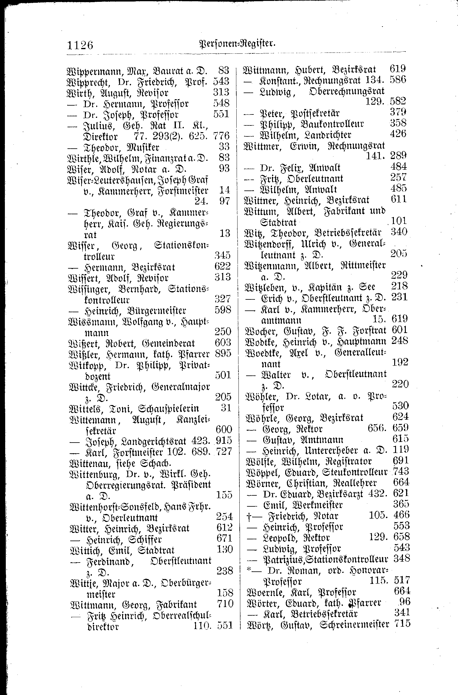| Wippermann, Max, Baurat a. D. | 83 | Wittmann, Hubert, Bezirksrat | 619 |