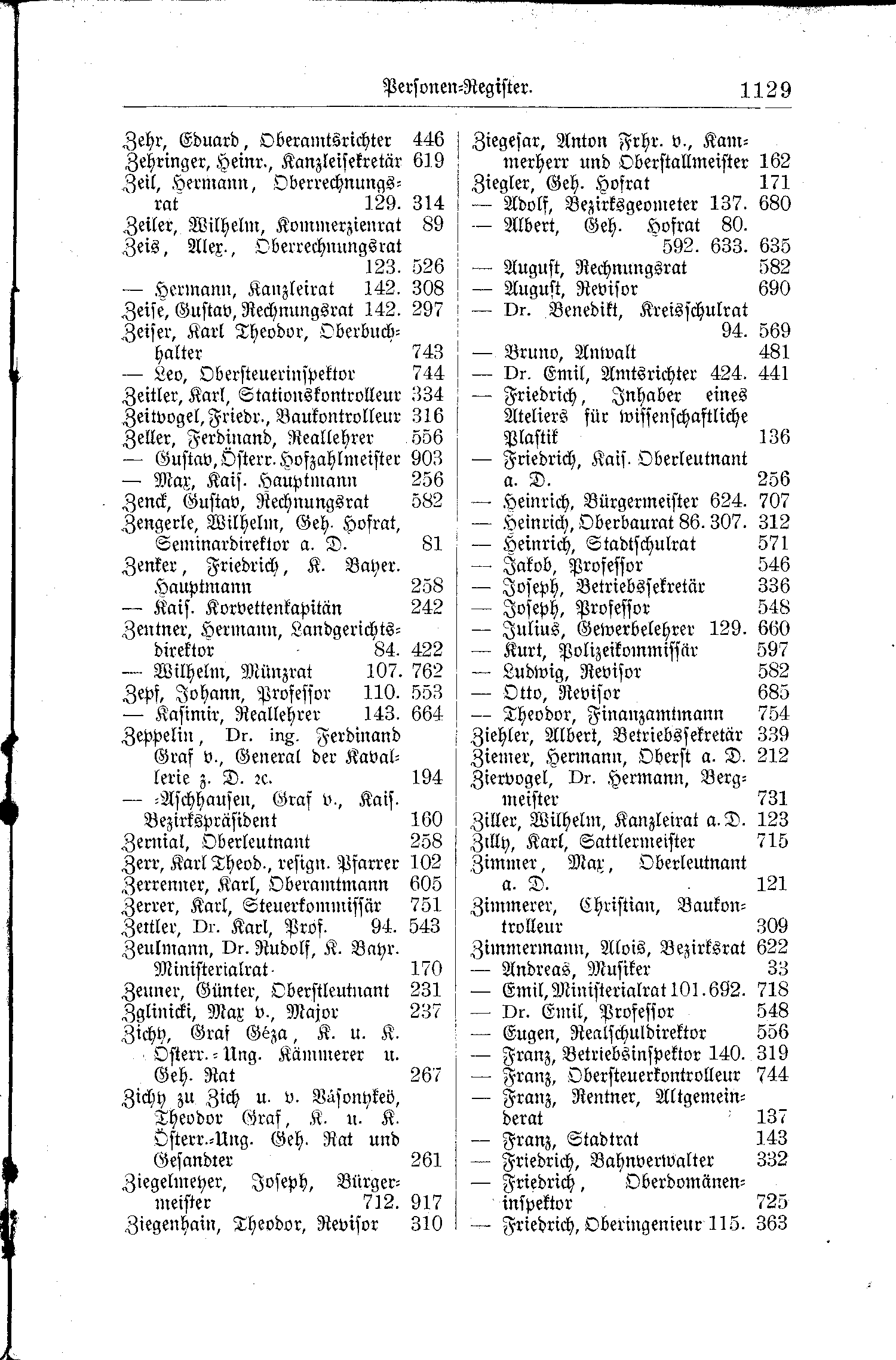 | Zeppeliin, Dr. ing. Ferdinand Graf v., General der Kavallerie z. D. sc. | 194 | Ziehler, Albert, Betriebssekretär | 339 |