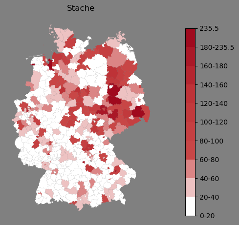 Relative Verteilung des Namens Stache (1996)Direkt zur Karte Die Farbskala zeigt die Anzahl von "Stache" bezogen auf je 1 Million Einträge. |
