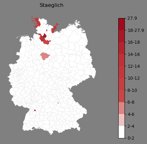Absolute Verteilung des Namens Staeglich (1890)Direkt zur Karte Absolute Verteilung des Namens "Staeglich" um 1890 im damaligen Deutschen Reich Sie können die Karte innerhalb des Fensters zoomen und verschieben. |